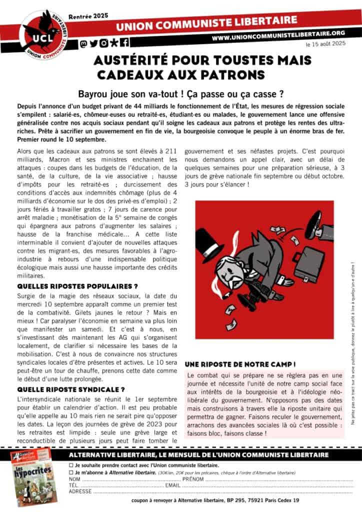 10 Septembre : Début d’une lutte prolongée !17/08/2025Tract Article précédent Contre la casse sociale, tout le monde dans la rue le 10 septembre! Article suivant 10 septembre : Union, action, autogestion