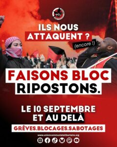 Le 10 septembre, à nous d’imposer des mots d’ordre pour nos droits sociaux et contrer l’accaparement des richesses par la bourgeoisie ! Bien sûr, l’extrême droite, soutien précieux de Bayrou, aimerait jouer un double-jeu et se faire une place dans le mouvement social qu’elle attaque pourtant. Ne lui laissons pas de place pour diviser la lutte ! Partout où c’est possible, posons d’emblée la revendication de 3 jours de grève pour imposer un réel rapport de force, car les manifestations isolées et la grève perlée épuisent sans créer de résultats. Seule une mobilisation massive et tenue dans le temps pourra faire plier le gouvernement.