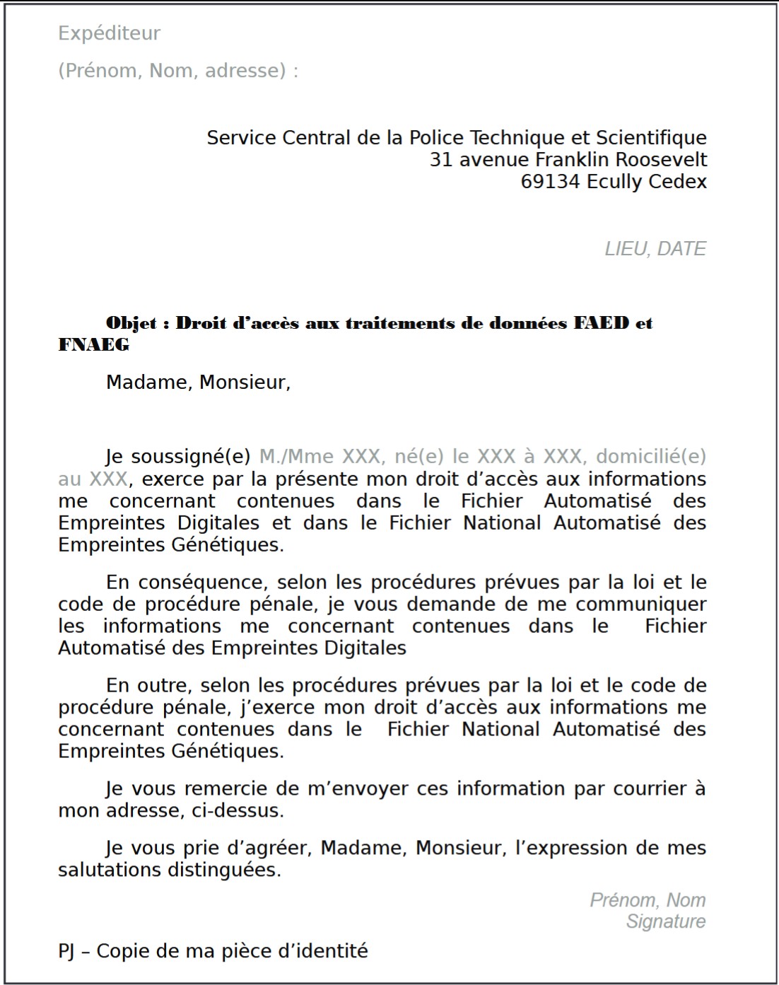 [3] Modèles de lettres parfois dans un format modifiable : « Actions collectives contre le fichage policier », Paris-luttes.info, 30 septembre 2018. Plus de modèles mais à recopier manuellement : « La folle volonté de tout contrôler et un atelier collectif pour sortir des fichiers », Rebellyon.info,8 décembre 2021.